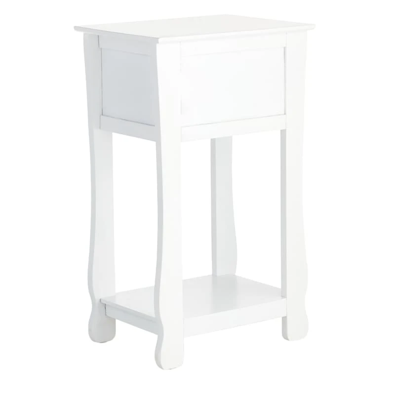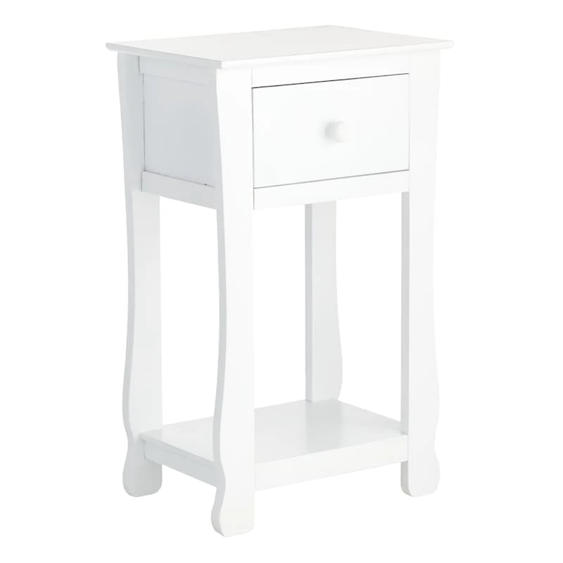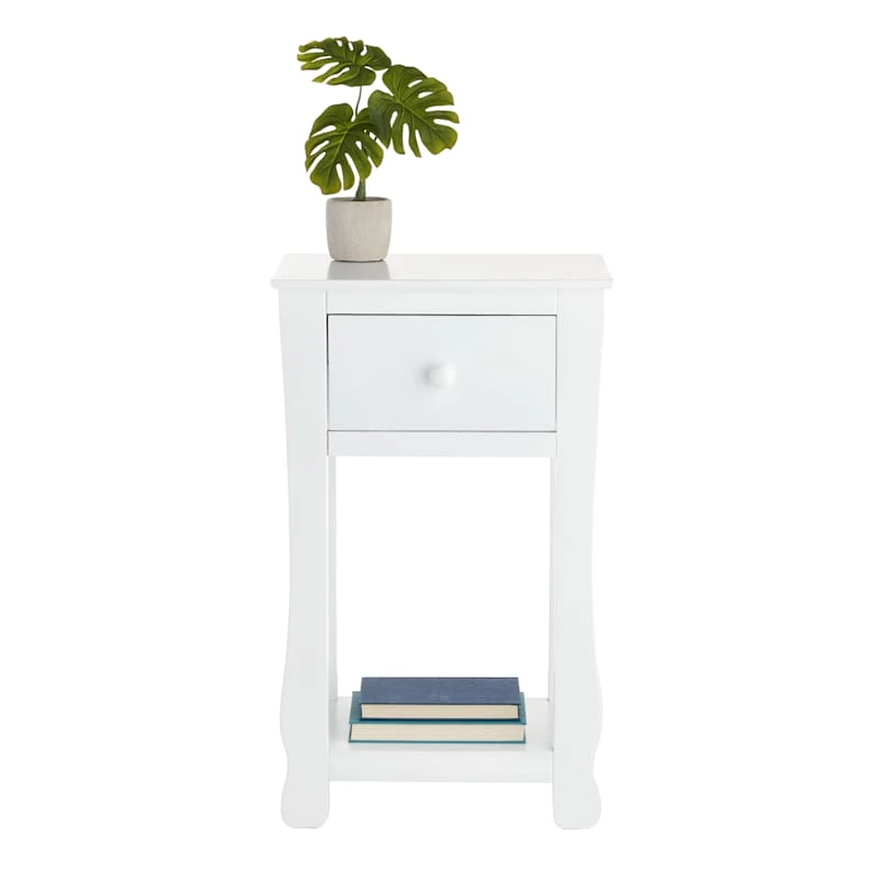 This single drawer end table makes it super convenient to snuggle up on the couch with a journal and a snack, or to settle into bed with tea and a book! Have everything you need within reach with this white accent table with drawer! Place a plant, decorative piece, or magazines on the bottom shelf and a reading lamp on the top. Or top it with a cluster of LED candles for cozy nights. Whatever your style, with its white color and solid, streamlined build, this table can easily become a part of your go-to relaxation nook!